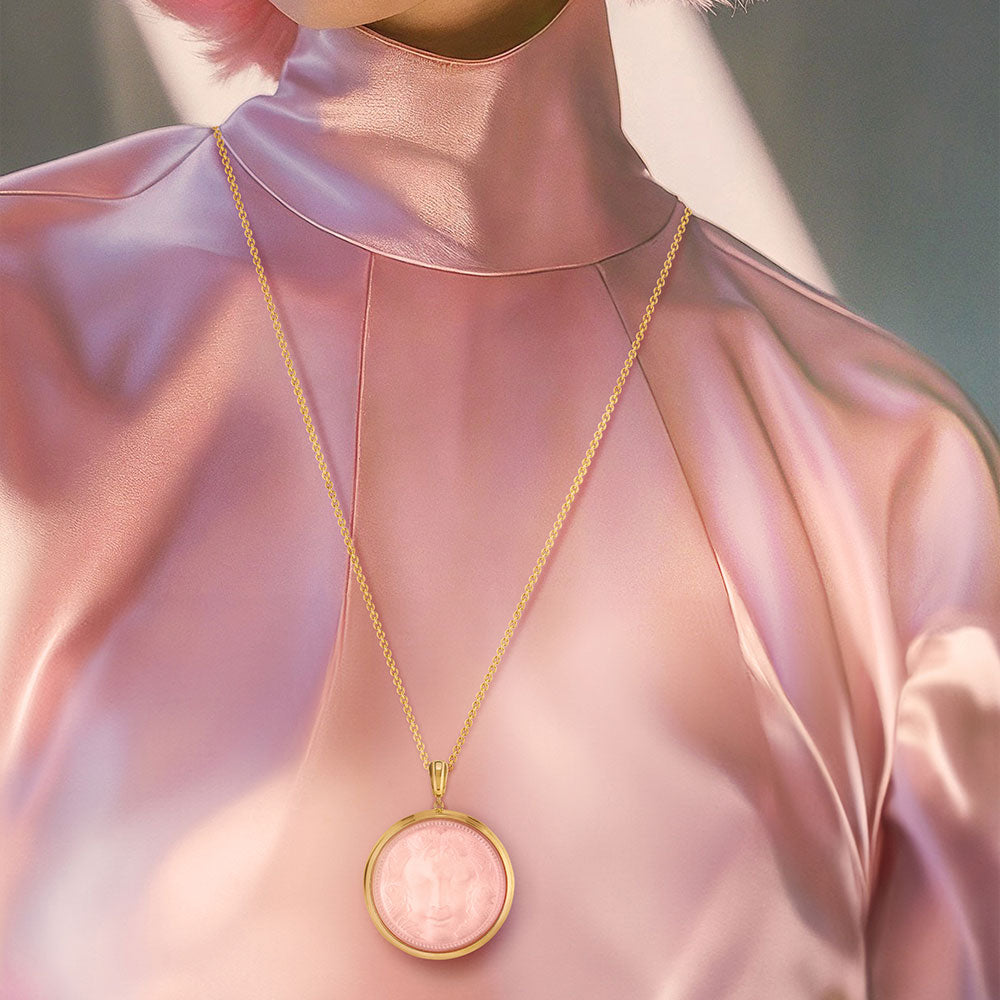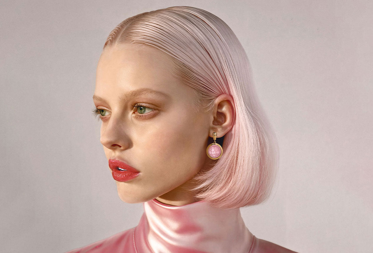 Created by René Lalique in 1935, the ‘Masque de Femme’ motif reveals the face of a mysterious woman, Arethusa, surrounded by aquatic fauna. Lalique continues the bold and avant-garde vision of its founder by creating a new rounded Rose Nebula pearly design, which softens the original aesthetic and gives it a futuristic and singular character.