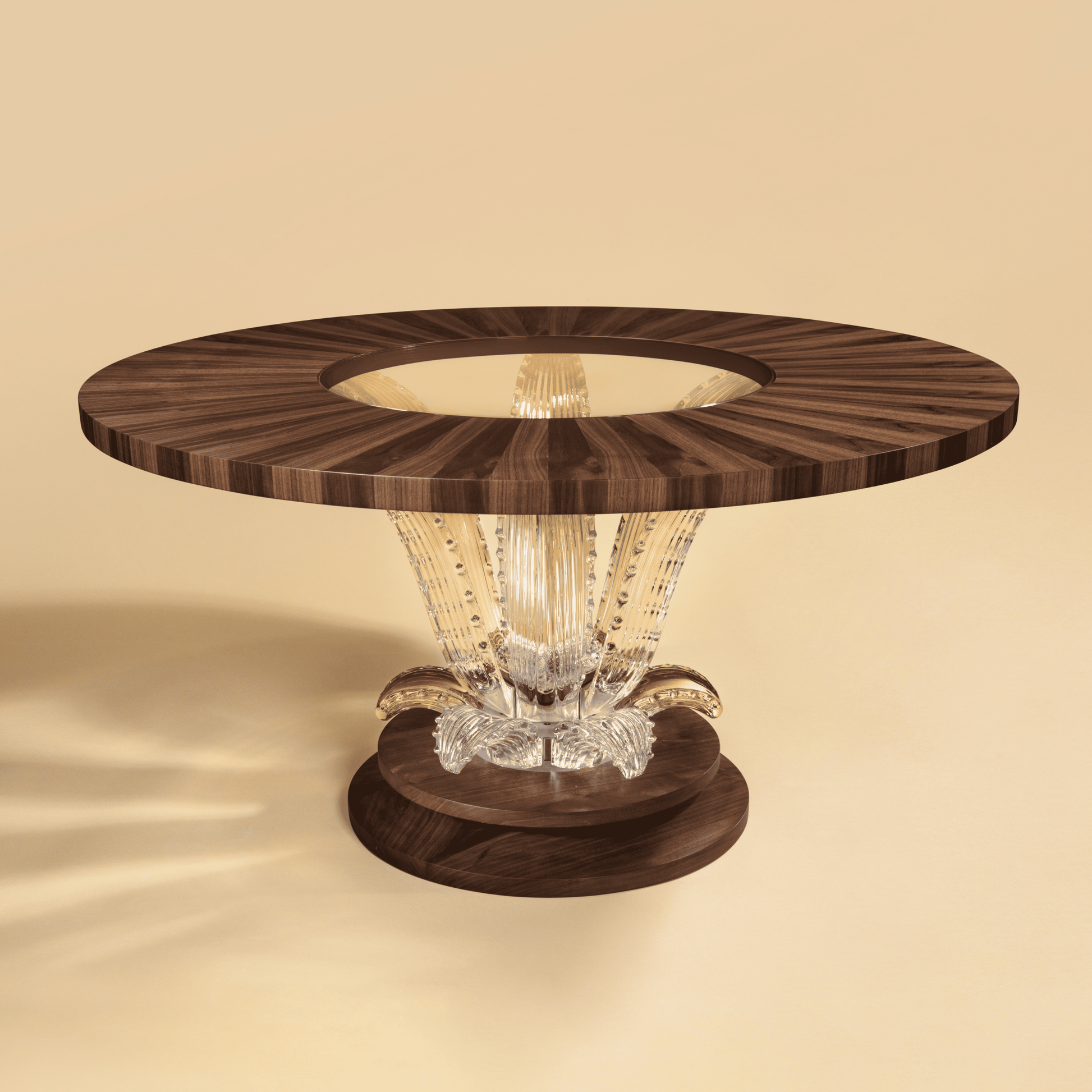Its round top, made of American walnut marquetry framing a glass panel, reveals the details of the crystal through transparency.